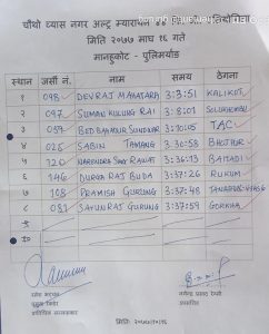 महताराले उक्त दुरी ३ घन्टा ३ मिनेट ५१ सेकेन्डमा पूरा गरेको आयोजक व्यास नगरपालिका कार्यालयले जनाएको छ । त्यस्तै प्रतियोगितामा सोलुखुम्बुका सुमन कुलुङ राई दोस्रो भएका छन् । उनले उक्त दुरी ३ घन्टा ८ मिनेट १ सेकेन्डमा पार गरेका थिए ।
